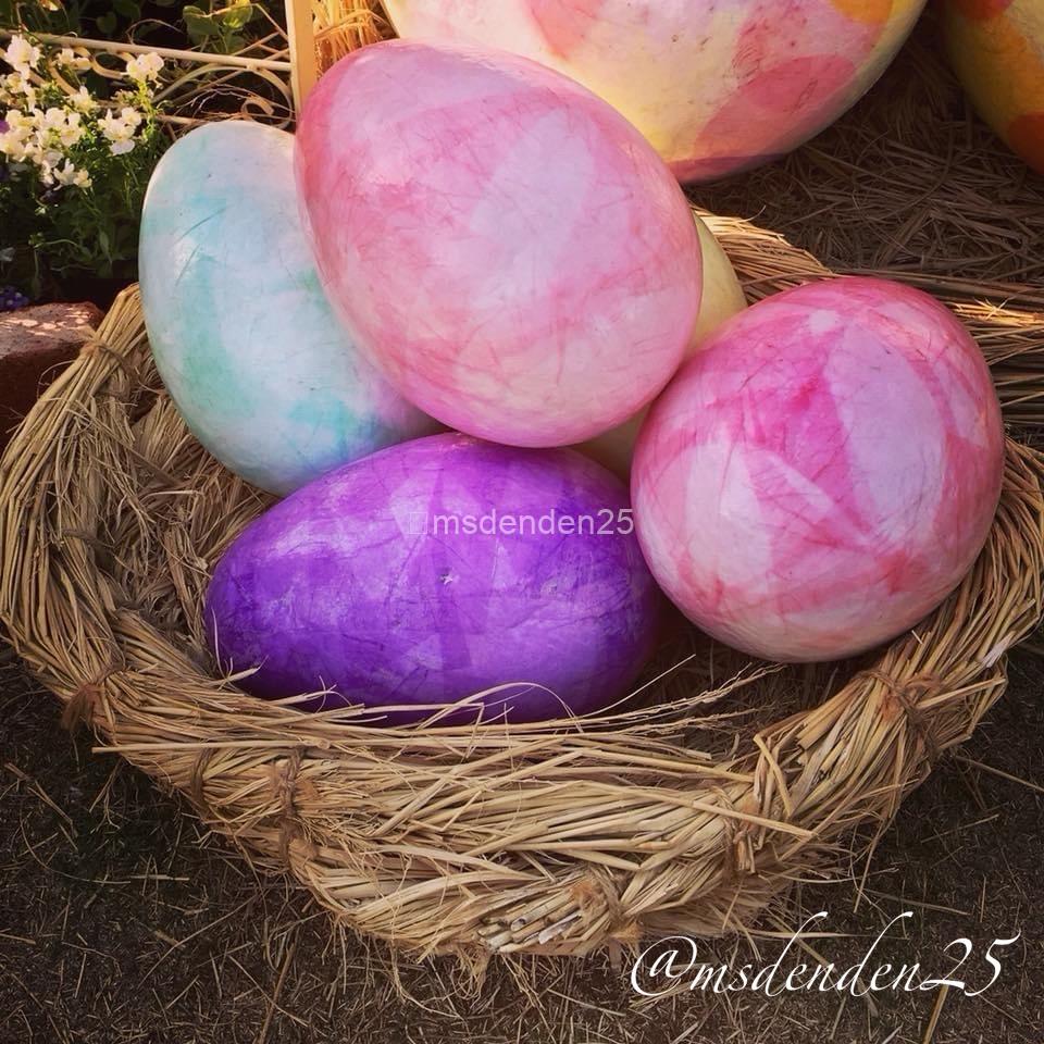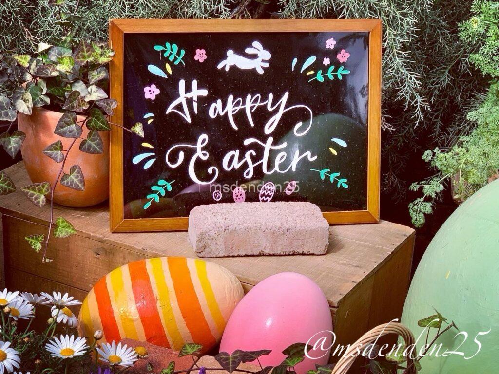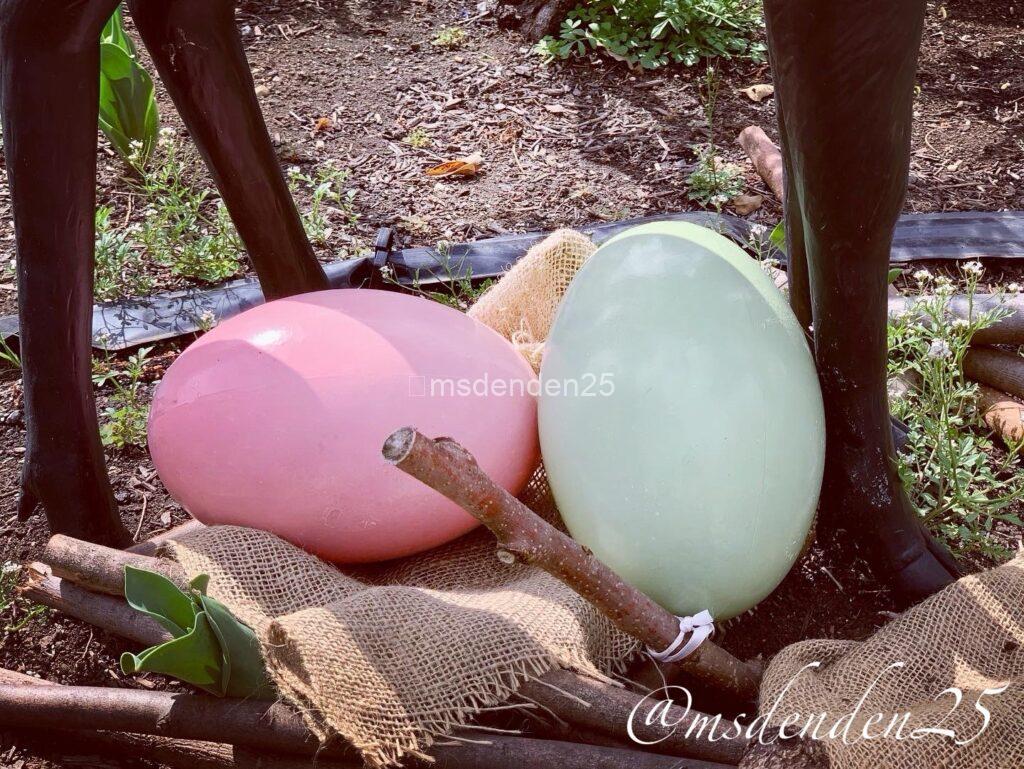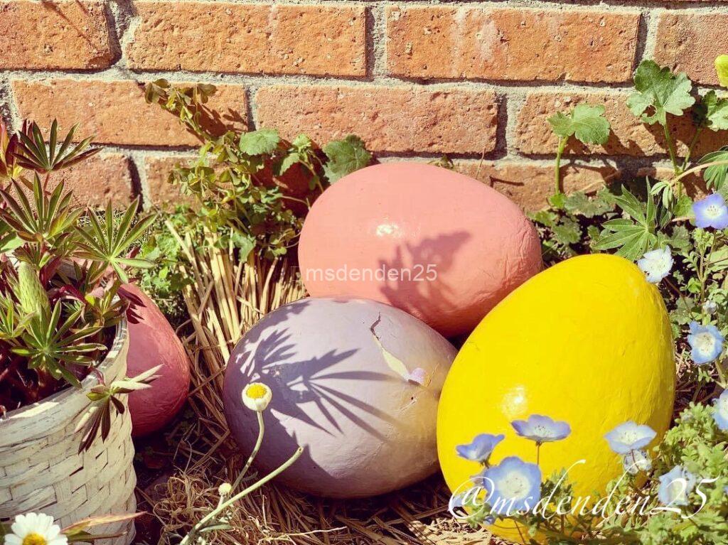 春を彩るイースターガーデン!巨大なエッグと木製カートが織りなすフォトジェニックな世界